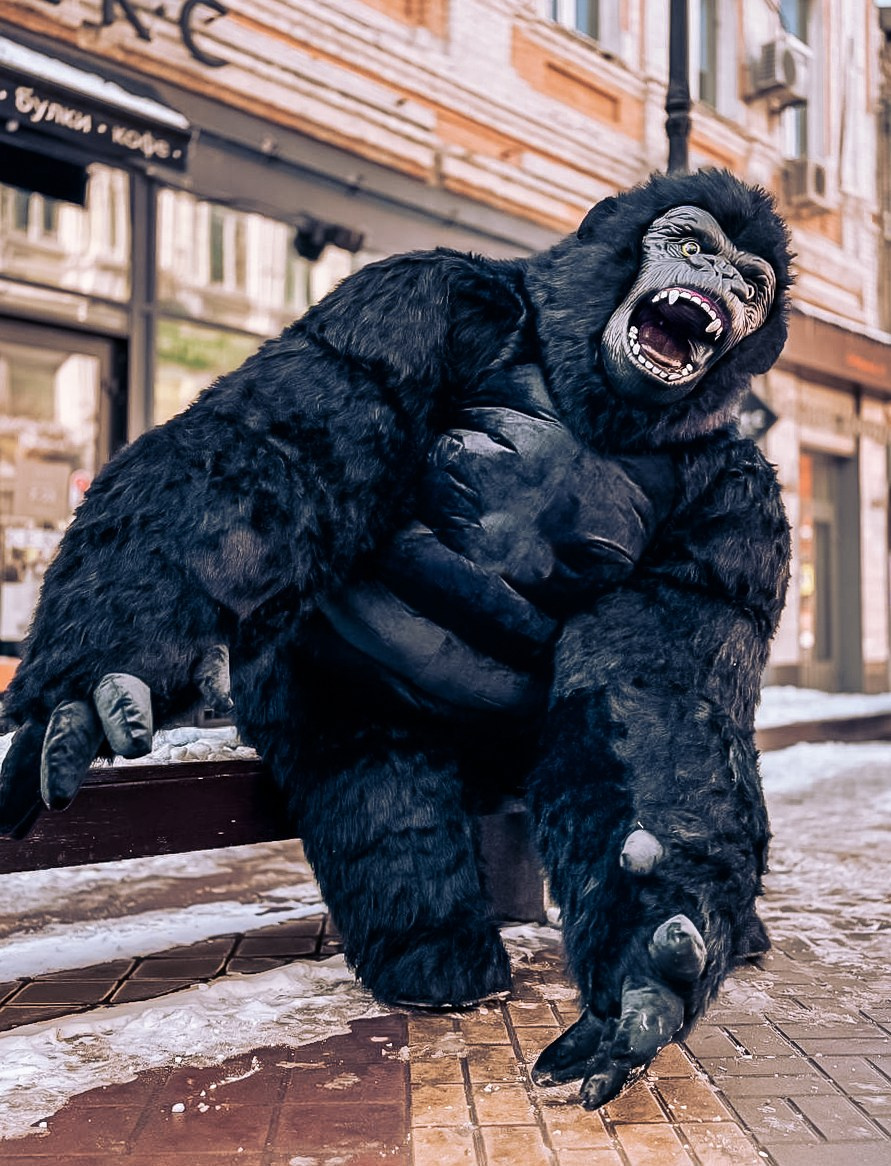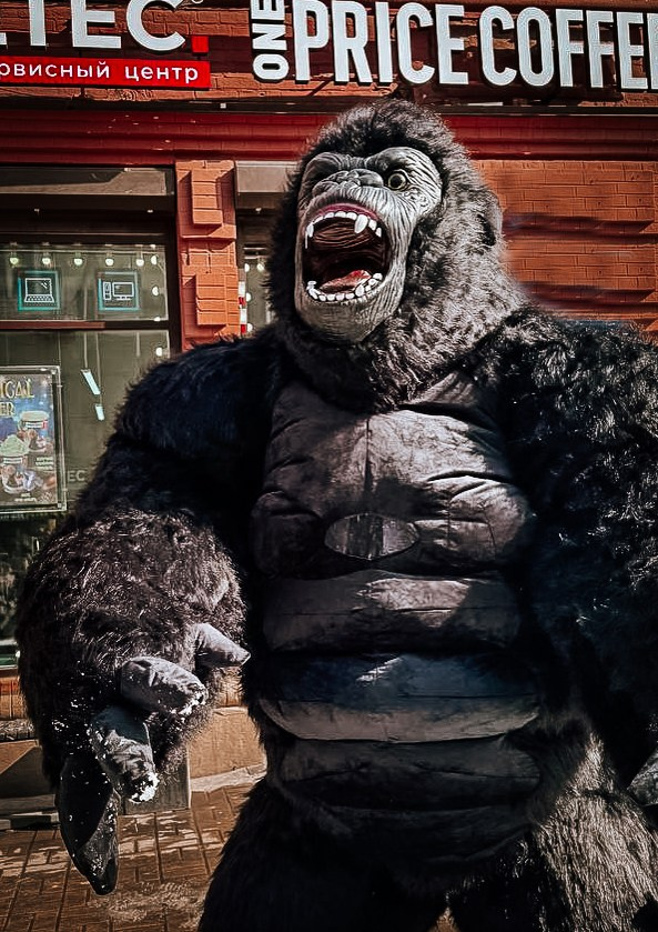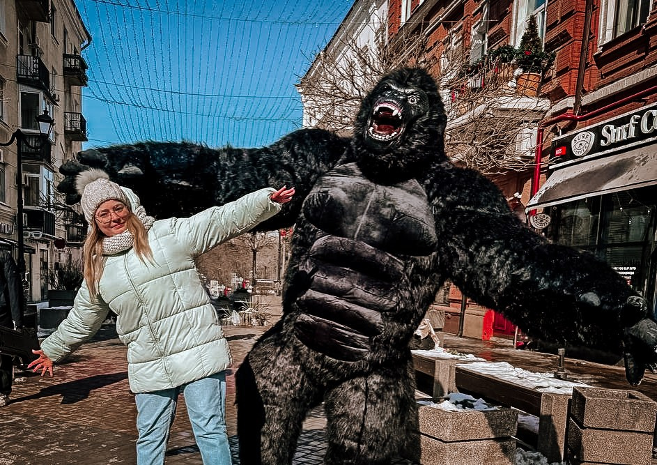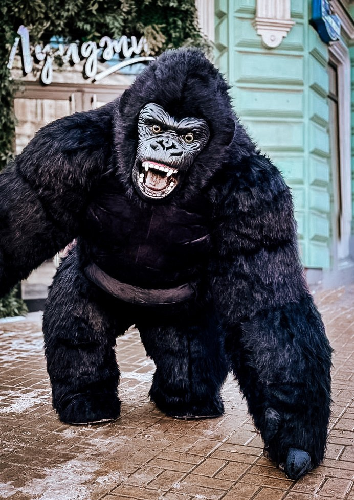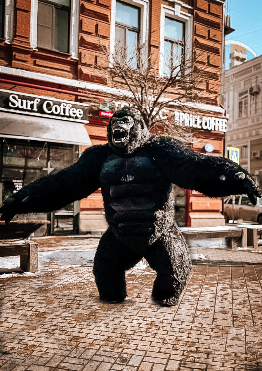 ростовая кукла горилла позирует на фото с фотографом Марина Ковалёва в городе Волгодонске