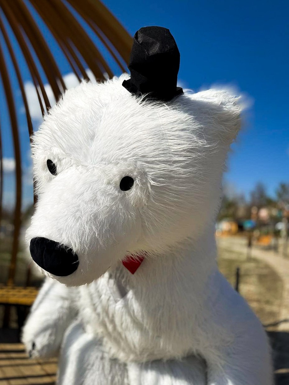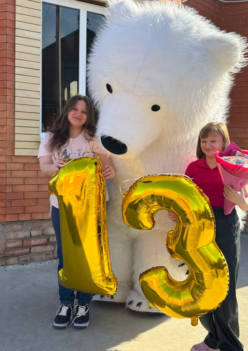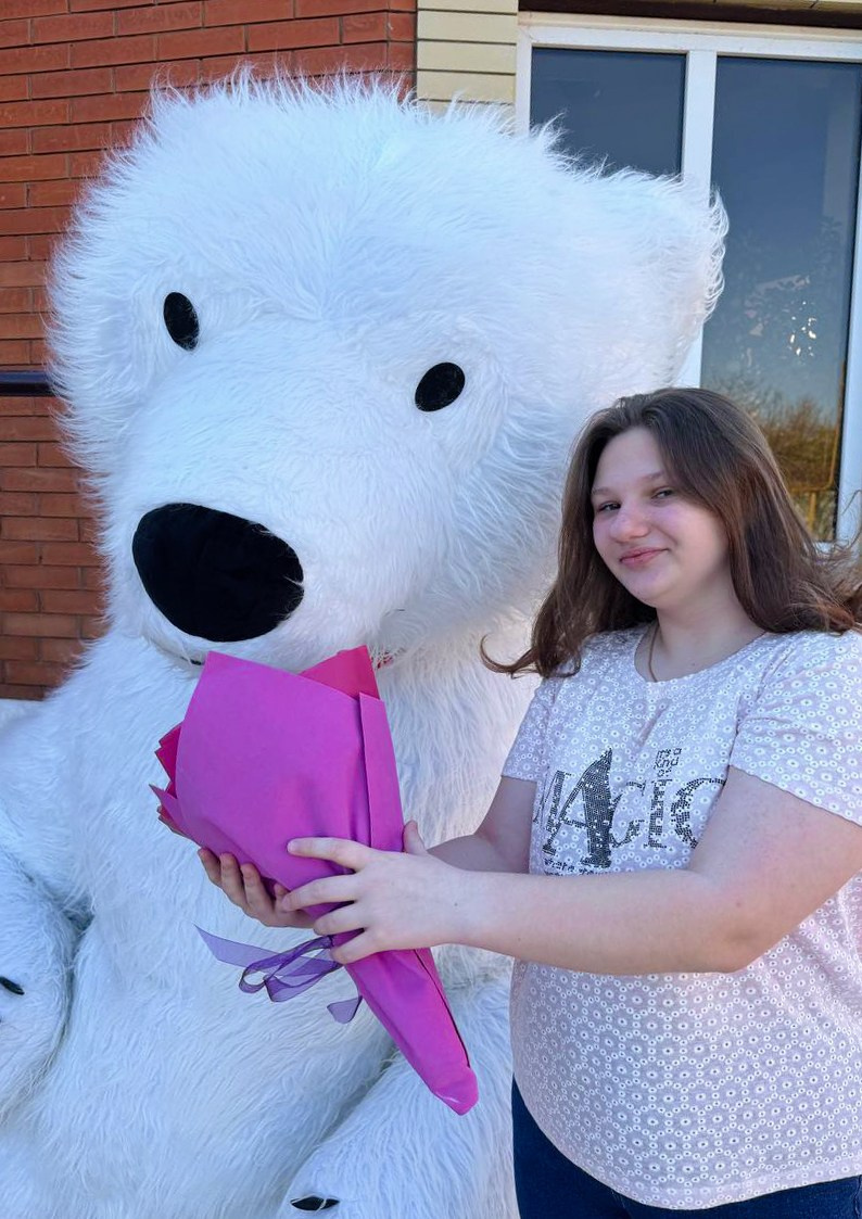 большой белый пушистый медведь поздравляет девочку с днем рождения