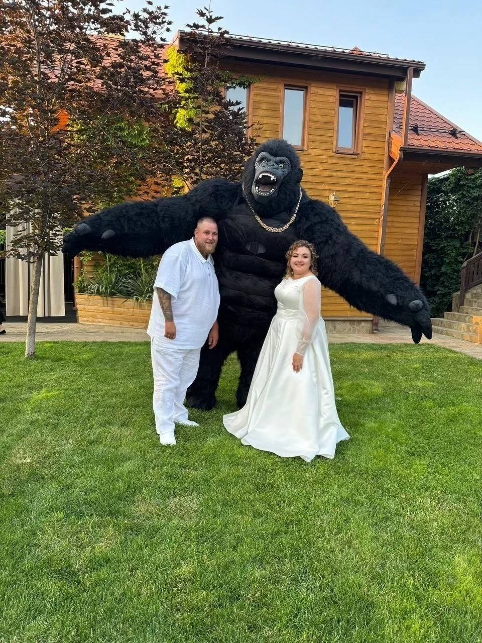 горилла ,ростовая кукла поздравляет молодожен на свадьбе и танцует танец невестой в городе Цимлянск